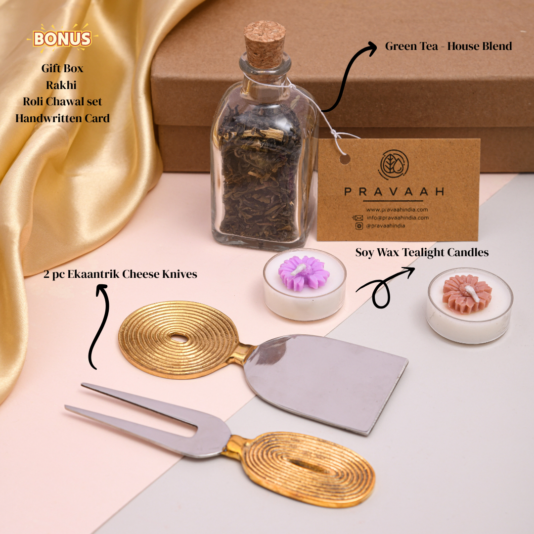 Celebrate Rakshabandhan with Curated Hosting a beautifully assembled gift box for the sibling who finds joy in setting the table, brewing the perfect cup, and making every guest feel at home. Whether it’s a cozy dinner or a festive gathering, this set adds elegance and intention to any hosting ritual.