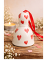 Add a small touch of love to any space with this handcrafted heart ceramic bell. Finished in an off-white glaze with hand-painted red heart motifs, this mini bell comes with a red hanging ribbon and a soft, pleasant chime.